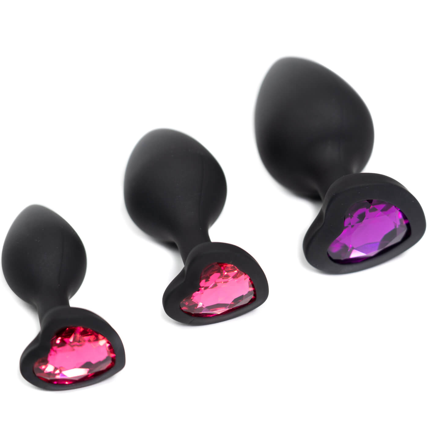 - 3 in 1 butt plug set featuring silicone jeweled butt plugs in different sizes ranging from small to large