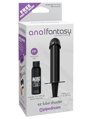 Shoot your lube precisely where you want it and ensure even more comfortable anal sex with the EZ-Lube Shooter! This phallic-shaped syringe holds up to 30 ml of your favorite liquid and once you push down on the plunger, the liquid of your choice will flow from the opening of the plastic dildo into any orifice you penetrate! With the EZ-Lube Shooter, there’s no more worrying about messy lube getting all over your sheets, couch, or dripping off of your dildo! Designed for one-handed ease of use, the smooth ABS plastic shooter injects a full load of lube that actually stays inside! Unlike ordinary lube dispensers, the EZ-Lube Shooter is thick and long enough to double as a satisfying dildo, while the hole at the tip is large enough to handle all liquids and creams. To fill the EZ-Lube Shooter, insert the plastic stopper into the tip, remove the plunger from the bottom of the shooter, then fill with the included Moist® Anal Lube. Replace the plunger, remove the plastic stopper from the tip, and allow a small amount of lube to coat the head to ease insertion. Once inserted, press the plunger handle down to release the lubricant into your body and you’re ready for comfortable, friction-free fun. Every Anal Fantasy box features a FREE 5-piece prep kit to help you ease into comfort and clean up afterwards. The kit includes two finger sleeves, Anal Eaze Insertz™ Cream, Moist® Anal Lube, and Refresh® Toy Cleaner. Insertable Length: 4.4" (11.3 cm) Width/Diameter: 1.3" (3.4 cm) • No More Stains or Messy Sheets • One-Handed Design for Easy Use • Injects Water-Based Lube Exactly Where You Want It • Smooth ABS Plastic is Phthalate-Free, Hygienic, and Easy to Clean • Flared Base for Safe Entry and Easy Removal