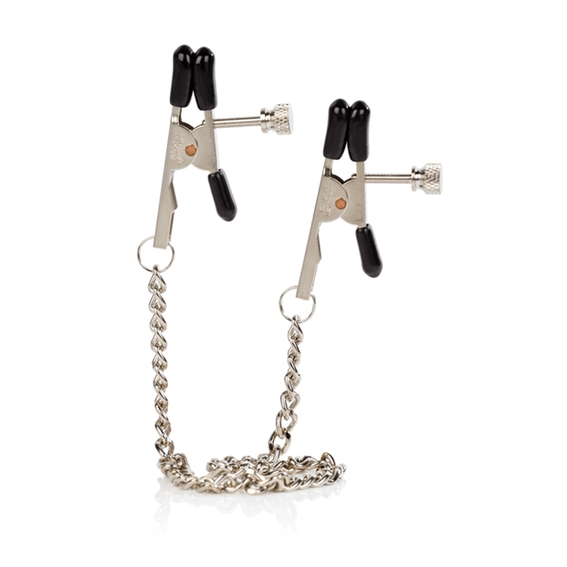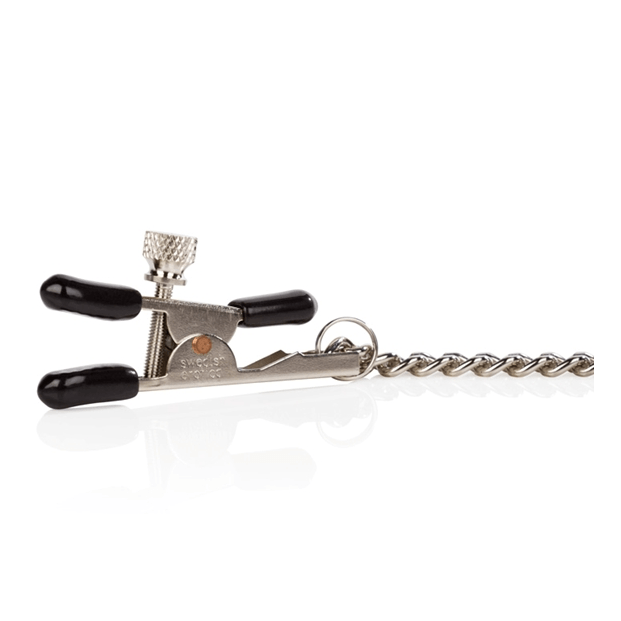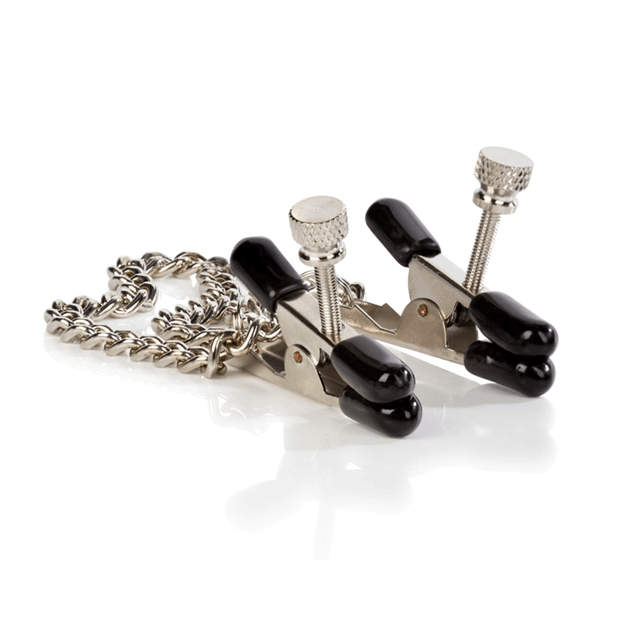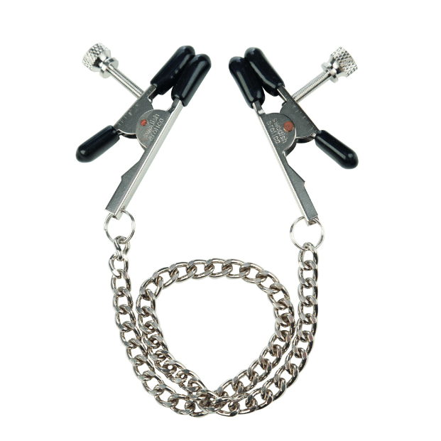 - Adjustable non-piercing nipple clamps with chain for an edgy look