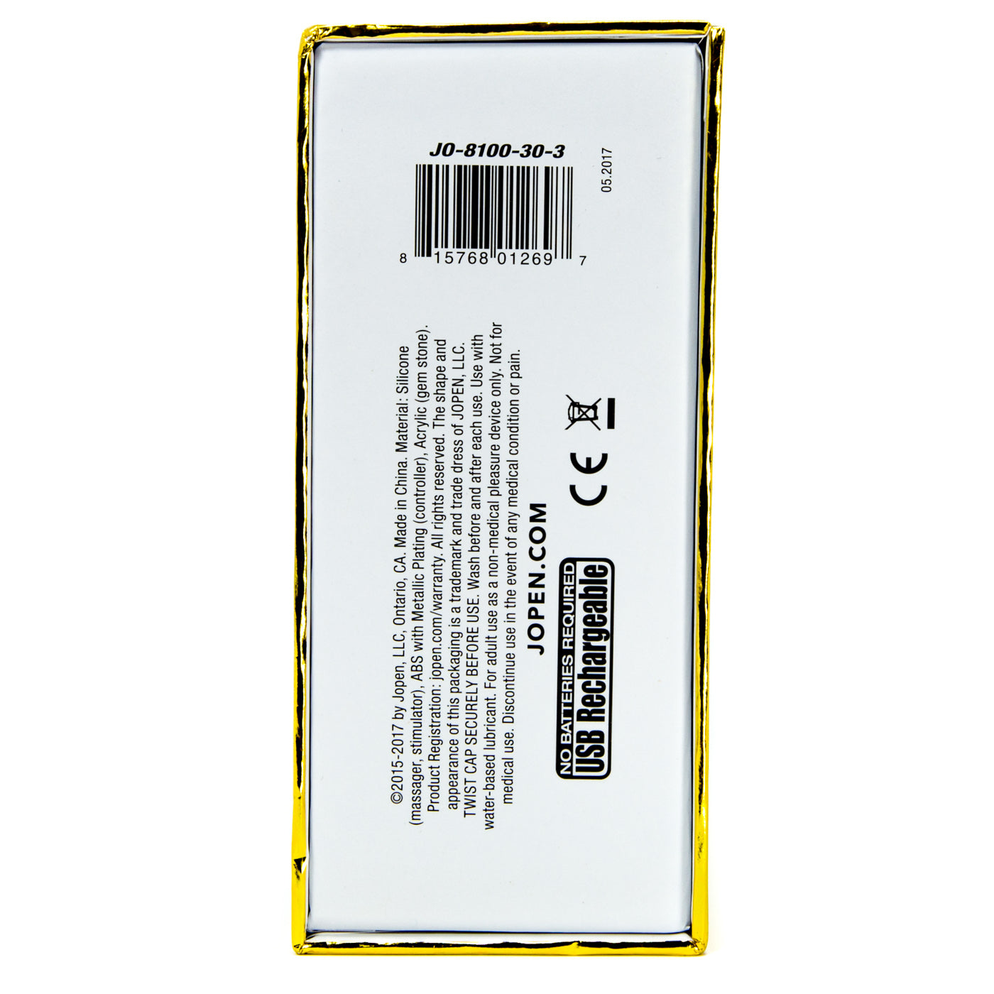 Jopen Callie Vibrating Dual Massager features 7 functions of intense vibration, pulsation, and escalation. 5 independent speeds for each function. Dual motors. Virtually seamless and Satin Finish Silicone. Luxury gemstone easy push button operation. USB rechargeable. Charging cord included. Complete charge in 2 hours. 100% Waterproof vibrations. 6 inches by 1.75 inches massager. 2 inches by .75 inch stimulator. 7.75 inches by 2.75 inches overall. One year warranty.