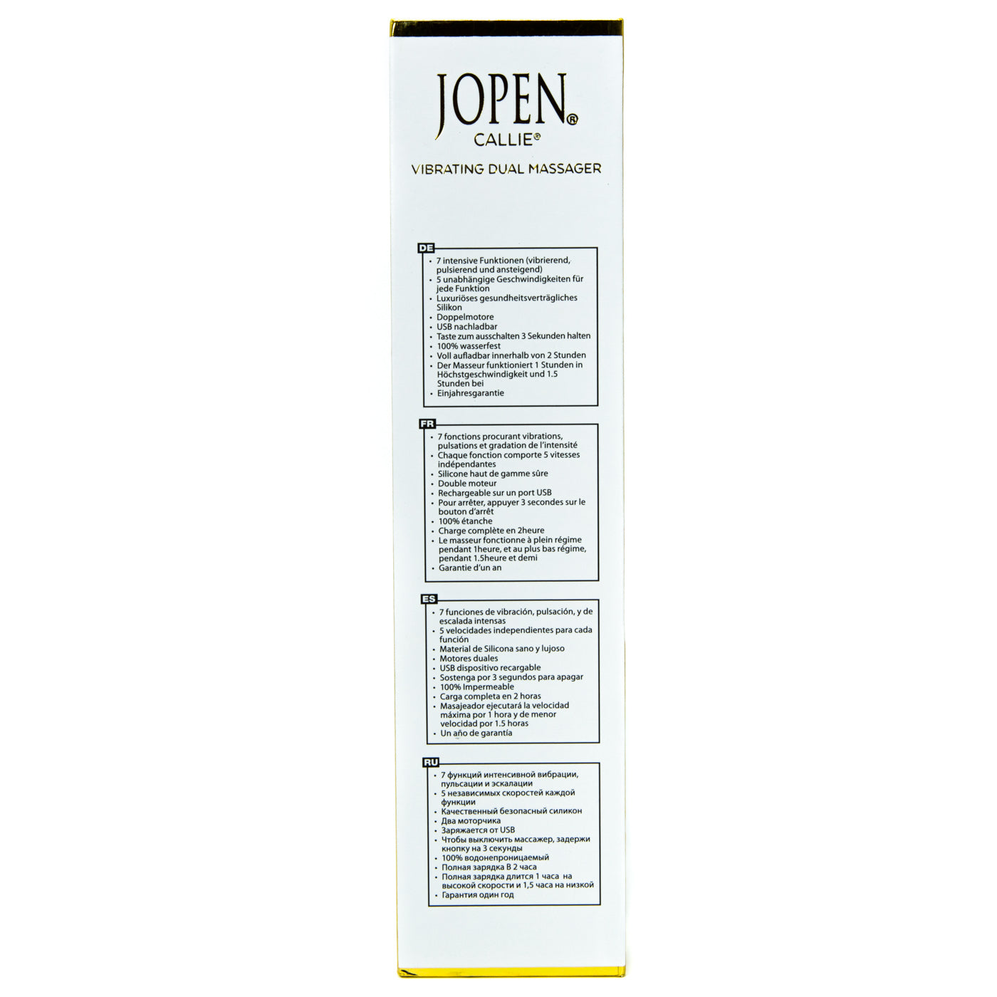 Jopen Callie Vibrating Dual Massager features 7 functions of intense vibration, pulsation, and escalation. 5 independent speeds for each function.