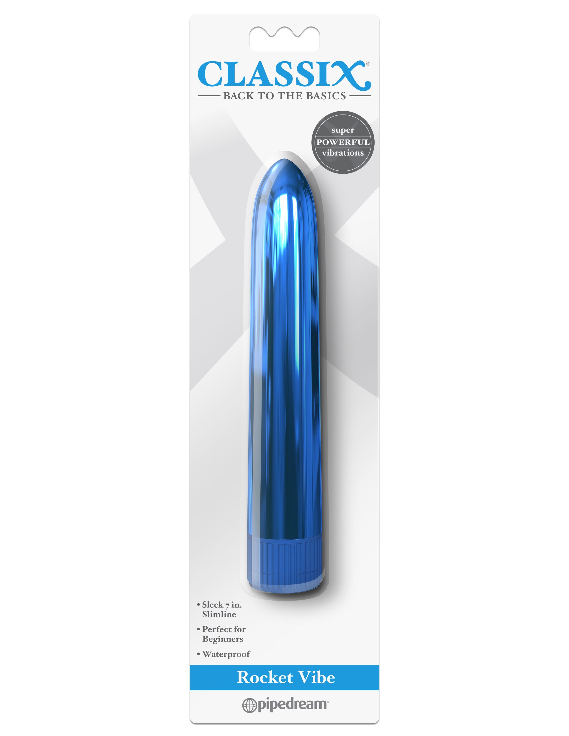 Blast off into orgasmic orbit with the Classix Rocket Vibe! This sleek 7-inch slimline features a brilliant metallic finish that shines like the stars and a powerful motor that will thrust you into ecstasy. The non-porous, body-safe vibe features an easy multi-speed dial to control the adventure! 3… 2… 1… Liftoff! • Perfect for Beginners • Sleek 7 in. Slimline • Waterproof