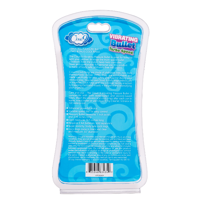 Care and Use: The Cloud 9 Vibrating Pleasure Bullet is compatible with both water based and silicone based lubes. Wash the vibrator and cock rings after each use in warm, soapy water or use Cloud 9 Toy Cleaner. Vibrator is not waterproof.