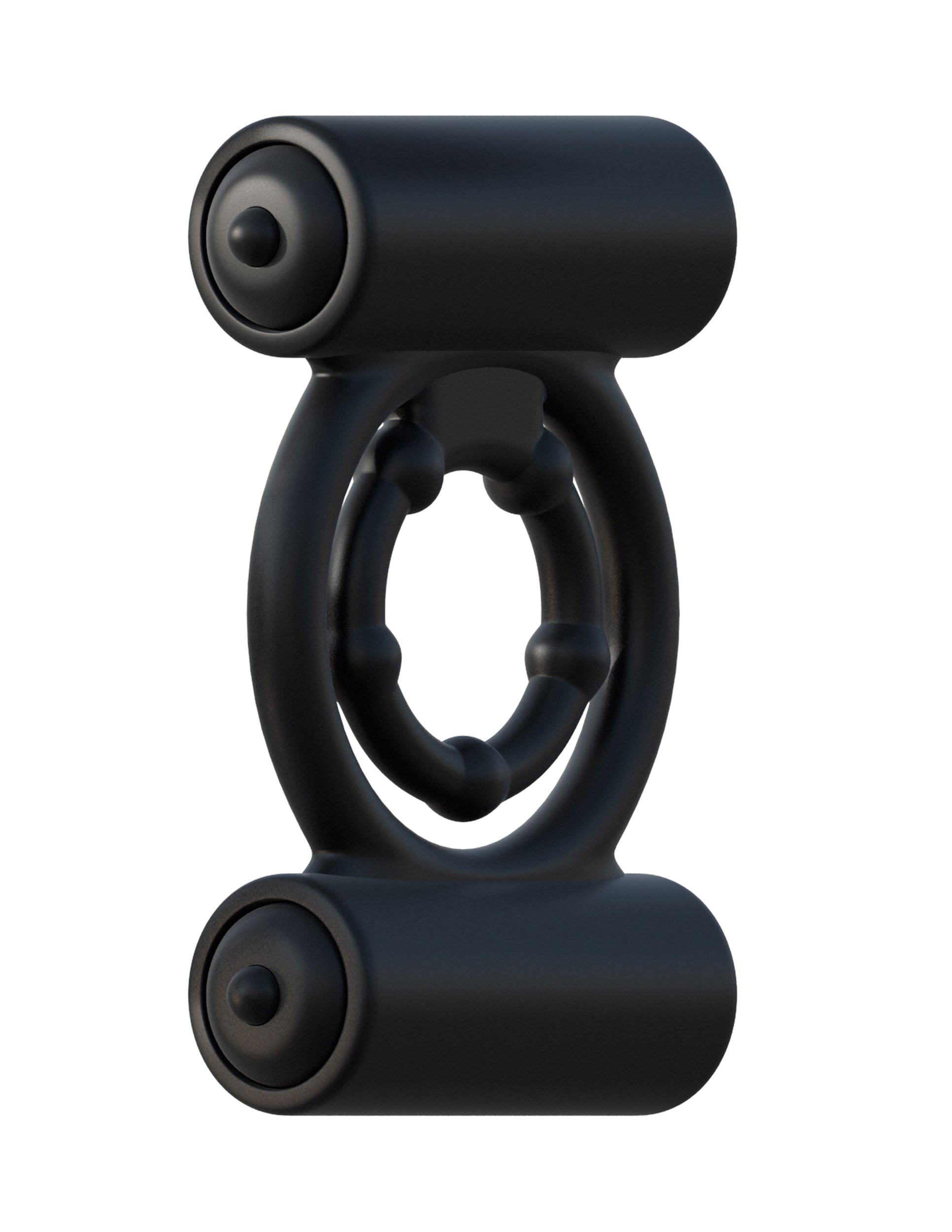 Double the pleasure and double the fun, two vibrating bullets are better than one! The Extreme Double Trouble will help you perform like a pro, last longer than ever before, and increase the fun for both of you. Made from body-safe, phthalate-free Elite Silicone, this dual-action stamina ring easily stretches for maximum comfort and proven results. The top ring wraps snug around your penis while the bottom ring wraps around both your penis and testicles. Try both rings pulled behind your whole package for an extra tight squeeze! The dual rings work together to put a clamp on performance letdowns and make you bigger, thicker, and harder than ever before! With two vibrating bullets on the top and bottom of the ring, both partners will enjoy the incredible sensations! The powerful vibrations will tickle and tease her clit and send pulsations through his shaft, turning his penis into a pleasure machine. Try it in the shower or hot tub and turn bath time into pleasure time. Cleanup is a snap after the fun with toy cleaner and warm water. Use plenty of Moist to ensure an extra wet and wild encounter! Inner Ring Diameter: 1" (2.5 cm) Outer Ring Diameter: 1.7" (4.3 cm)