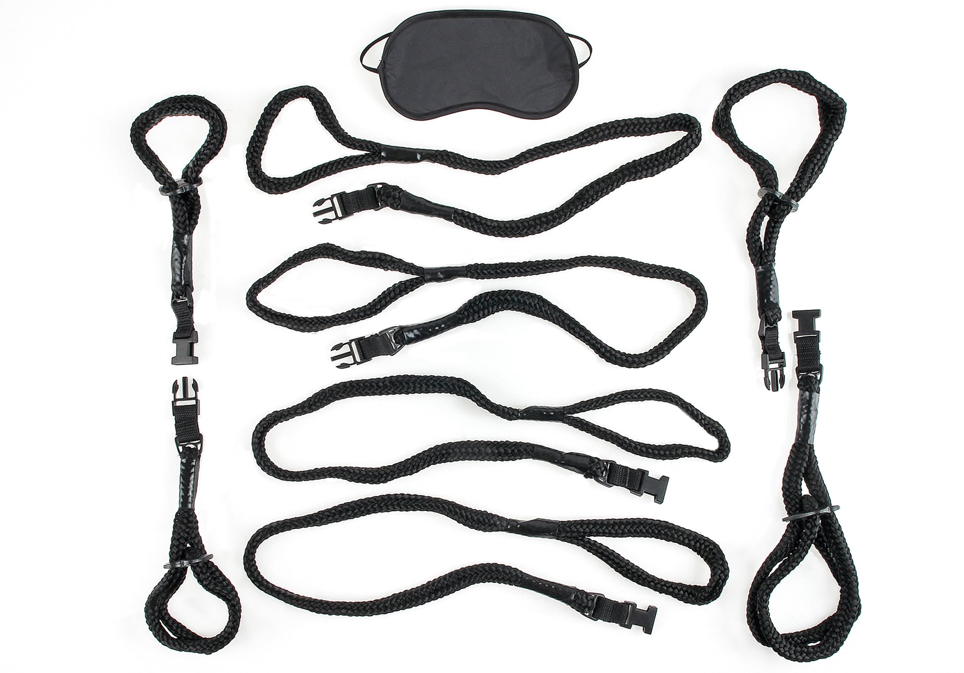 Explore the seduction of ancient Japanese rope-play with this beginner's Rope Cuff and Tether Set. These sexy silk rope cuffs and tethers feel great on your body, but with a simple tug on the plastic cinch, you're held comfortably captive and at the mercy of your lover! The cuffs and tethers all interconnect using sturdy plastic clips, allowing you to explore new positions you never thought were possible. The tethers also have loops at the opposite end of the clip, so you can slide them around a bed post or bed frame. Go ahead, use your imagination to combine the restraints and enjoy endless love-making possibilities. Experience the thrill of bondage and explore your deepest fetish fantasies! Includes: Rope Wrist Cuffs Rope Ankle Cuffs 4 Rope Tethers Free Satin Love Mask