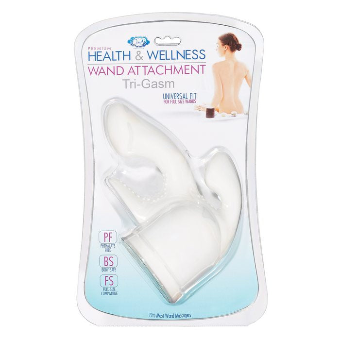 Cloud 9 Full Size Trigasm Wand Attachment. The Full Size Tri-Gasm Wand Attachment triples the fun! This uniquely designed attachment is perfect for hitting all the right erogenous zones. It includes three separate massaging tips with added textures pads to stimulate the G-spot, P-spot and surrounding sensual areas. Fits most wand massagers.