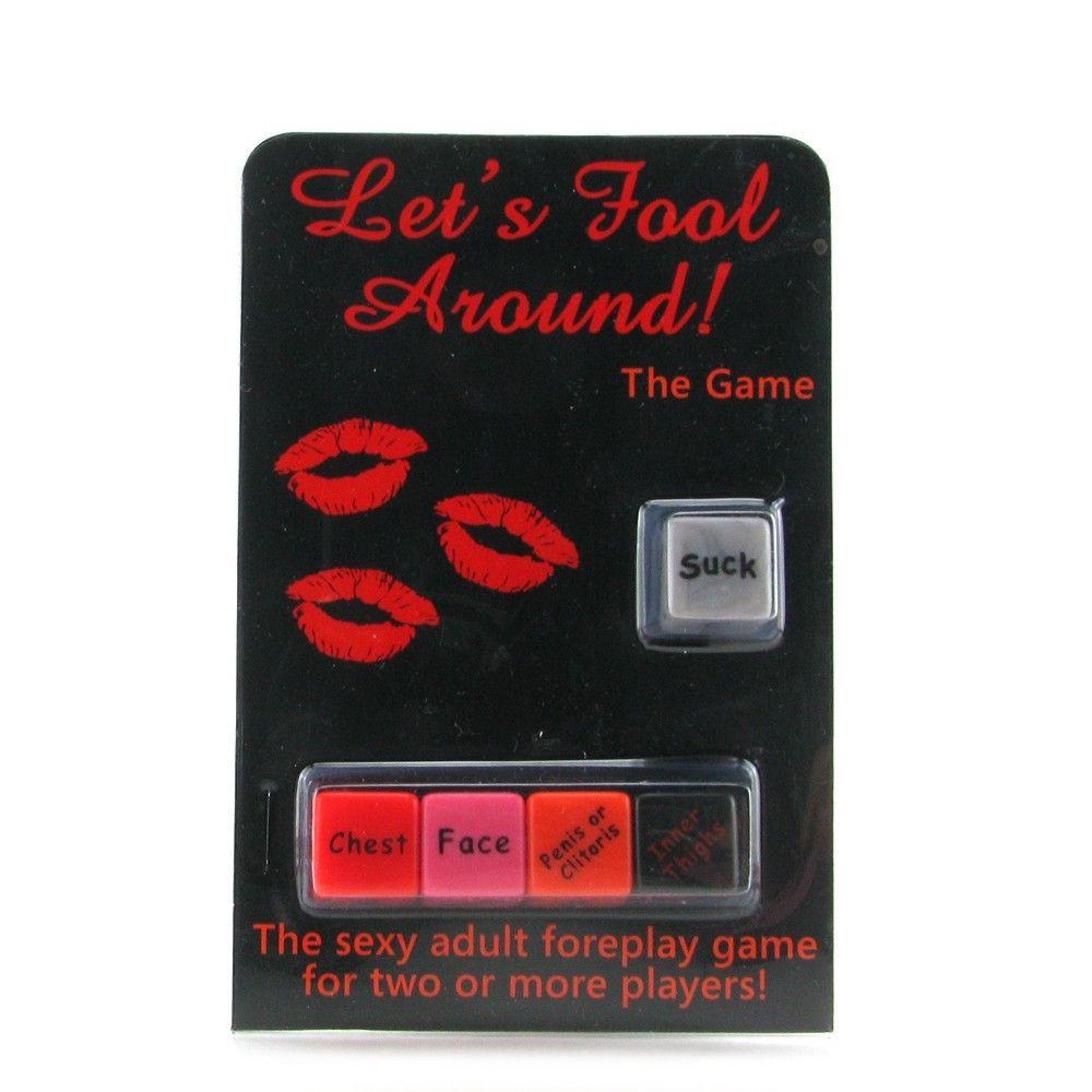 The "Let's Fool Around" Dice Game includes one silver die with actions on it such as "kiss" and "suck". The other four dice are labeled with body parts.