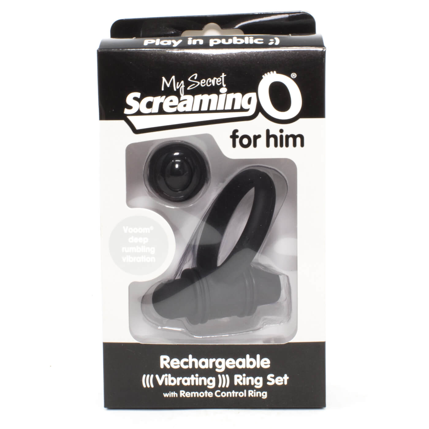 My Secret Screaming O Bullet and Ring for him for hands free perineum or testicle massage. Powered by deep rumbling Vooom vibration.