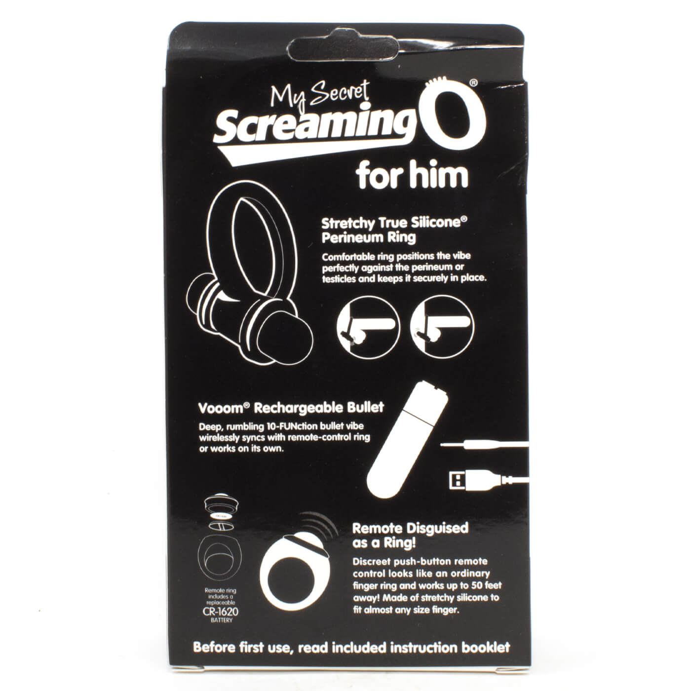 My Secret Screaming O Bullet and Ring for him for hands free perineum or testicle massage. Powered by deep rumbling Vooom vibration. 100% waterproof bullet vibe. Clever one size remote control disguised as a finger ring. Lab tested, body safe True Silicone cock ring and ABS plastic bullet vibrator. My Secret Screaming O Rechargeable Bullet and Ring for Him makes it easy to play in public with a compact rechargeable waterproof bullet vibe that positions perfectly against the perineum or testicles (your choice!).