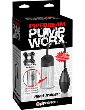 Give your head a little tease and watch your cock grow bigger and thicker than ever before! By applying direct vacuum suction to the most sensitive area of your cock, the Head Trainer feels just like a real blowjob – only better! The super-soft TPR pleasure sleeve wraps tight around your head and clings to your shaft, creating a super-strong vacuum that produces maximum results. With each squeeze of the medical-style pump ball, the Head Trainer creates blowjob-like suction and delivers rock-hard erections that last and last. The super-tight suction sheath adds a whole new dimension to penis pumps, making this Head Trainer the ultimate go-to foreplay pump to get you ready for action. The majority of nerves in your penis are located around the head and frenulum, so this vibrating mini pump directly targets your most sensitive areas. You won’t believe how amazing the Head Trainer feels every time you squeeze the medical-style pump bulb! Simply press the quick-release button to instantly relieve pressure. To prolong ejaculation, slide the included enhancement ring over your shaft until it's nice and snug. The tight squeeze will prolong ejaculation, help maintain your erection, and extend the fun. When you're done, simply detach the cylinder from the vacuum hose and restore it to like-new quality with toy cleaner and warm water.