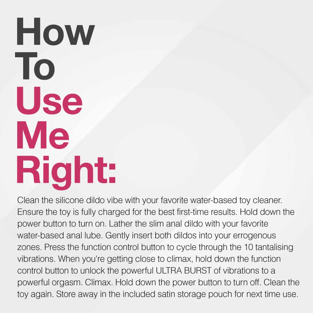 Enjoy the ULTRA 10 Function Vibrating Silicone Double Penetration Dildo even more with a high-quality water-based lubricant!