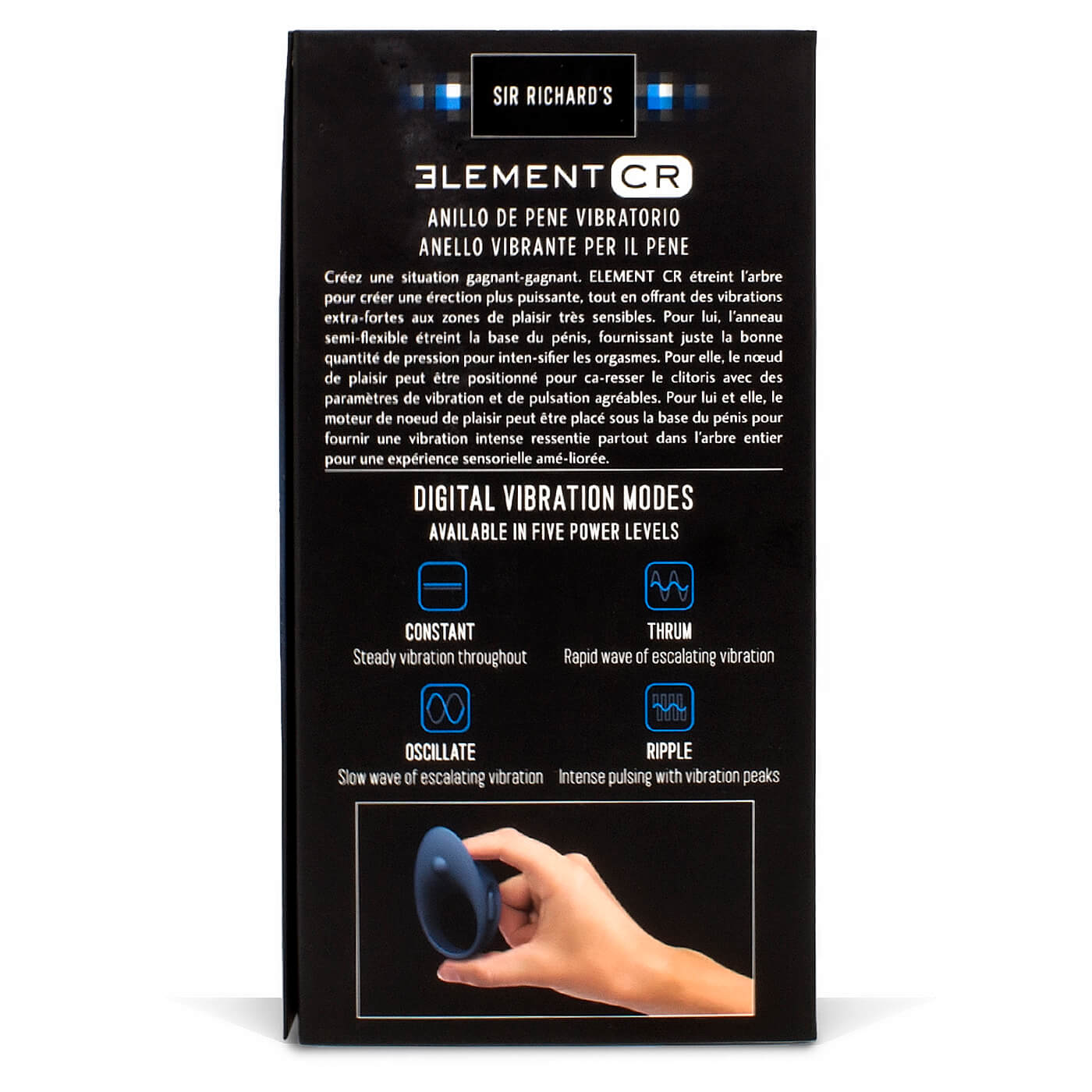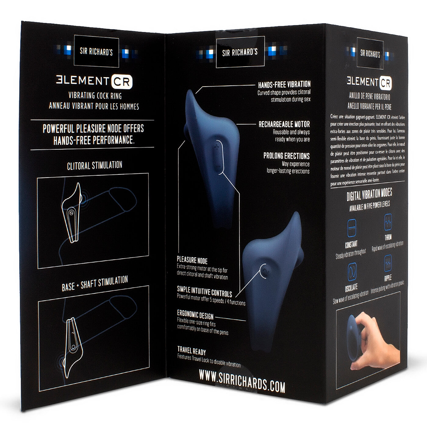 Sir Richard's Element Vibrating Cock Ring Gray. Create a win win situation. Element Cock Ring hugs the shaft to create a more powerful erection, while offering extra strong vibration to highly sensitive pleasure zones. For him, the semi-flexible ring hugs the base of the penis, providing just the right amount of pressure to intensify orgasms. For her, the pleasure node can be positioned to caress the clitoris with pleasing vibration and pulsation settings. For him and her, the pleasure node motor can be positioned underneath the base of the penis to provide intense vibration felt throughout the entire shaft for a heightened sensory experience.