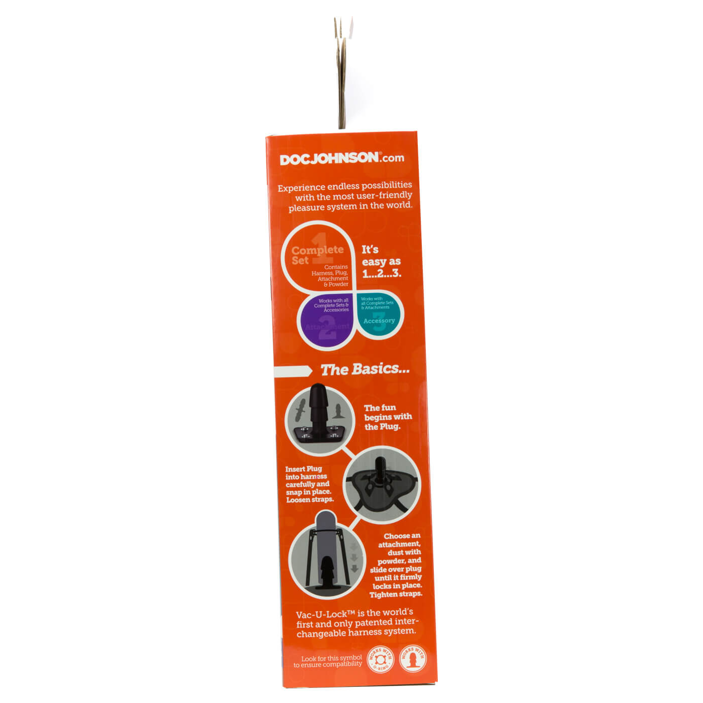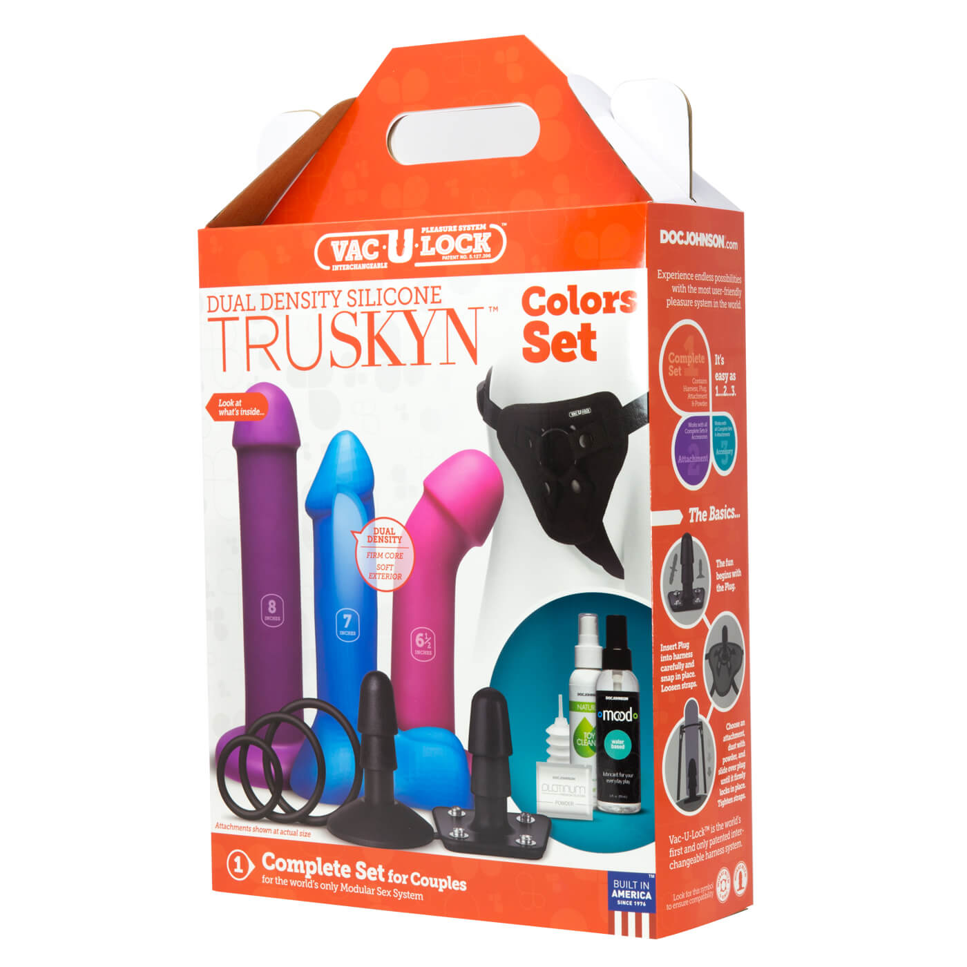 Vac-U-Lock Dual Density Silicone TruSkyn Colors Set. Your perfect strap-on experience is on lock with Doc Johnsons deluxe line of full service Vac-U-Lock Harness Sets.Ready for a role reversal romp? The Vac-U-Lock Platinum Silicone Pegging Sets three slim, custom designed attachments in Platinum Premium silicone are specially contoured to stimulate the prostate and sized for various levels of experience and comfort. Snap your choice of these smooth, non-anatomical attachments onto the Supreme Harness via the included Vac-U-Lock plug, fit the adjustable straps to your body, and apply some of the Mood water based lube, and you are ready to explore. Attachments can be used with the harness, the included Vac-U-Lock suction cup, and any other accessory or harness in the line. The Vac-U-Lock Dual Density Starter Set also includes Doc Johnson Natural Toy Cleaner and Ultraskyn Refresh Powder to properly and hygienically maintain your dual density Ultraskyn attachments. Every product in the patented Vac-U-Lock system is designed to help you create any strap on or toy you are in the mood for, and it is as simple as popping on the attachment of your choice.