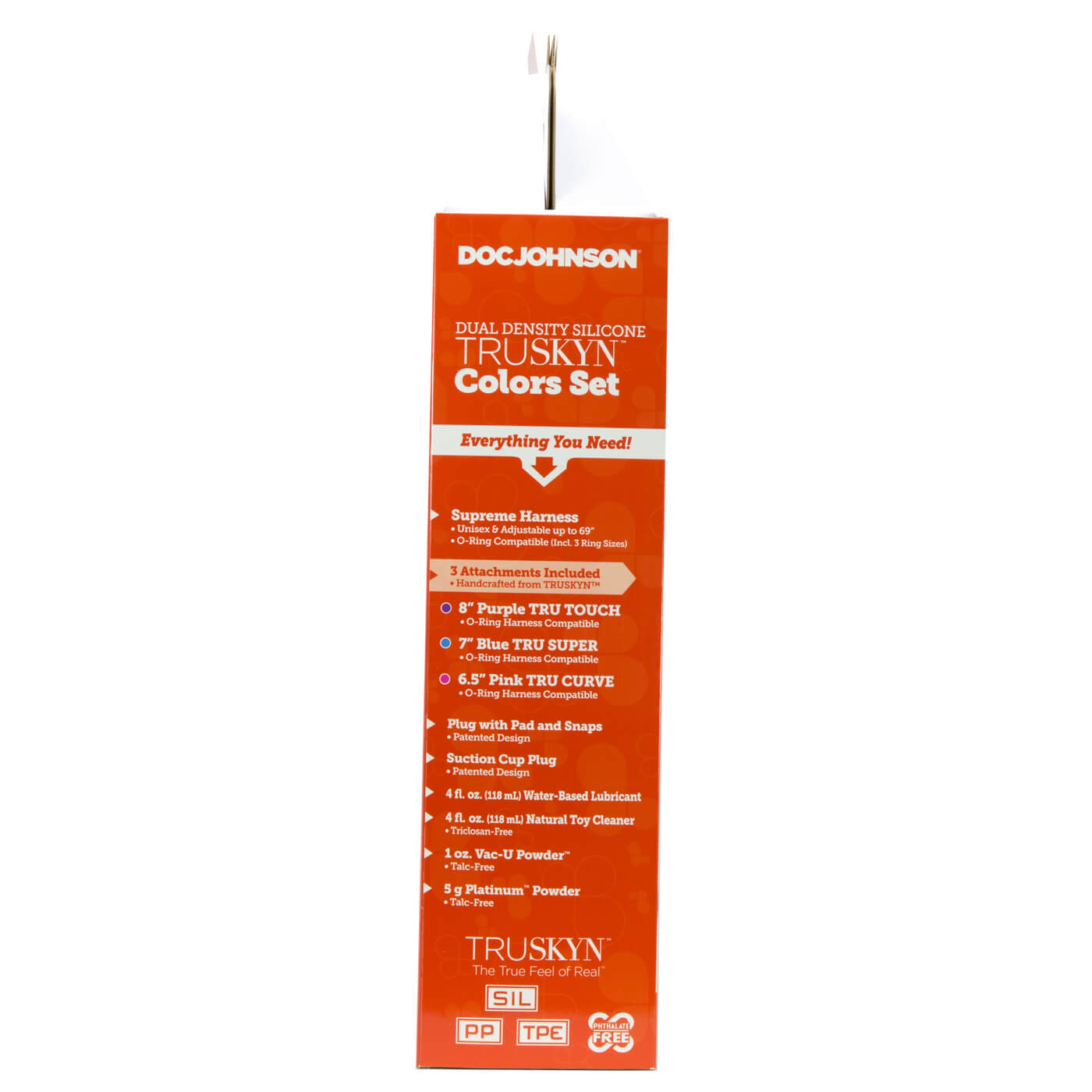Features: unisex Supreme Harness is adjustable up to 69 inches. O-ring compatible. Includes 3 ring sizes. Three Platinum Silicone attachments. 8 inches Purple Tru Touch, 7 inches Blue Tru Super, 6.5 inches Pink Tru Curve. Plug with pad and snaps. Suction cup plug. 4 fluid ounces water based lubricant.4 fluid ounces Natural Toy Cleaner. 1 ounce. Vac-U Powder. 5g Platinum Powder. Phthalate free, talc-free, body safe. UPC number 782421057473.
