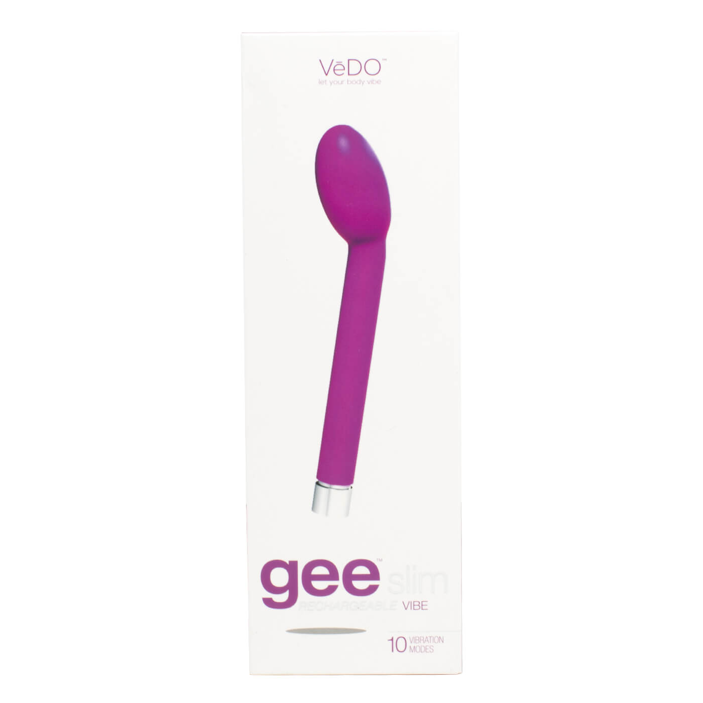 Vedo Gee Slim Rechargeable G-Spot Vibe Foxy Pink slim boasts 10 super powerful vibration modes and silky smooth silicone that always leaves you wanting more. The long, thin shaft and perfectly curved head not only makes finding your G-Spot a snap, but will have you howling at the moon, night after night. For those who also like to get wet and wild as they play, the gee slim is completely submersible. Features: extremely powerful motor. Rechargeable. USB cable included. 10 vibration modes. One button easy control. Extremely quiet. Velvety smooth silicone. Rounded tip is designed for an easy insertion. Waterproof for play in and out of the water. Submersible for water play.